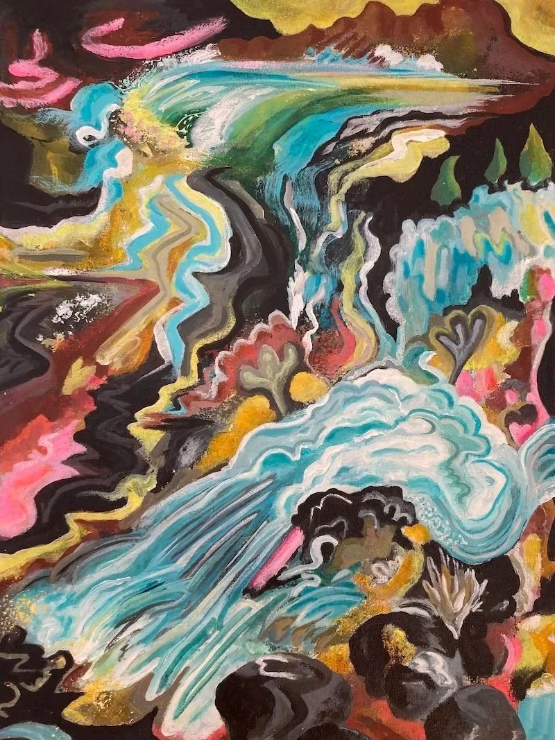 2023 saw the artist completing her first public commissions. These included a ground mural in Edgware as part of Edgy Collective’s award-winning installation for the London Festival of Architecture and a collaborative mural with children, parents and the local community for Claremont Primary School in Cricklewood. Her first solo exhibition, Turbulent Waters, was held at artsdepot in 2024, with OVERFLOW opening at Lauderdale House in 2025.
